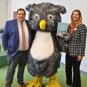 Charleston County Board of Voter Registration and Elections Executive Director Isaac Cramer and Charleston County Public Library Executive Director Angela Craig with the real life Owlbert.